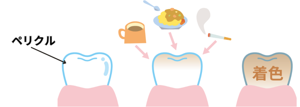 エナメル質の表面は『ペリクル』と呼ばれる薄い保護膜で覆われています。このペリクルは歯を着色から守ったり、細菌から歯を保護する大切な役割を果たしています。