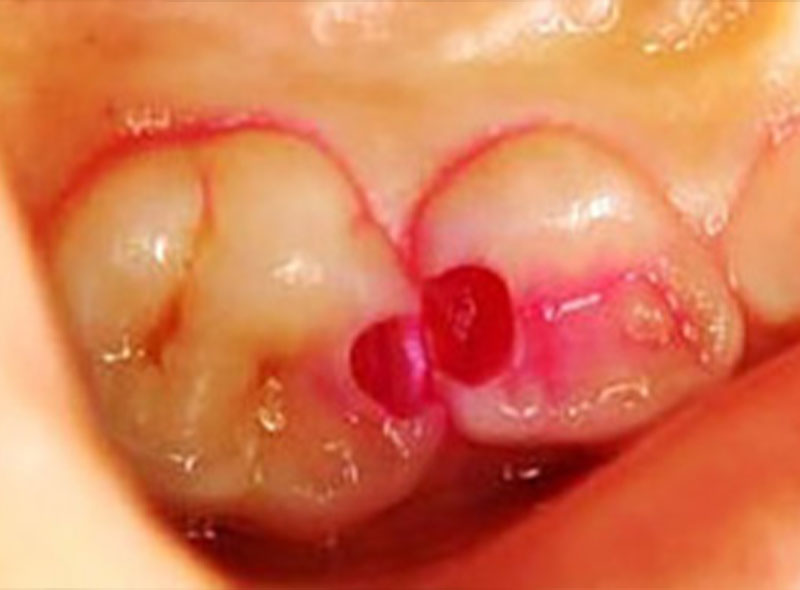 神経にまで虫歯が到達すると、神経は炎症を起こします。神経の一部分のみの炎症であれば、部分断髄法で、炎症部分だけを切除します。この場合も、残された神経をMTAセメントで覆います。